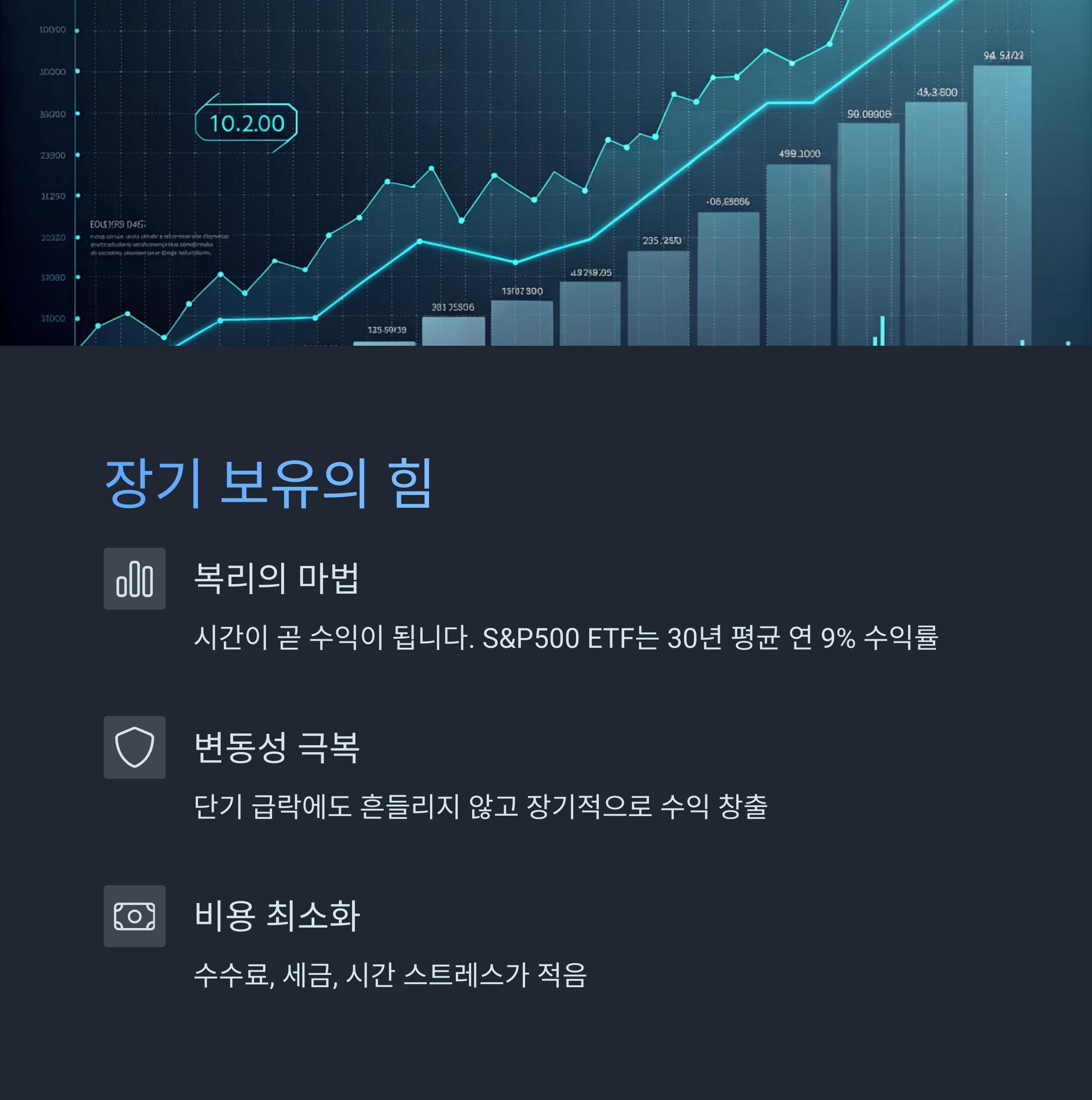 예: 미국 S&P500 ETF는 30년 평균 연 9% 내외 수익률 유지 - 시장의 일시적 변동에 휘둘리지 않는다