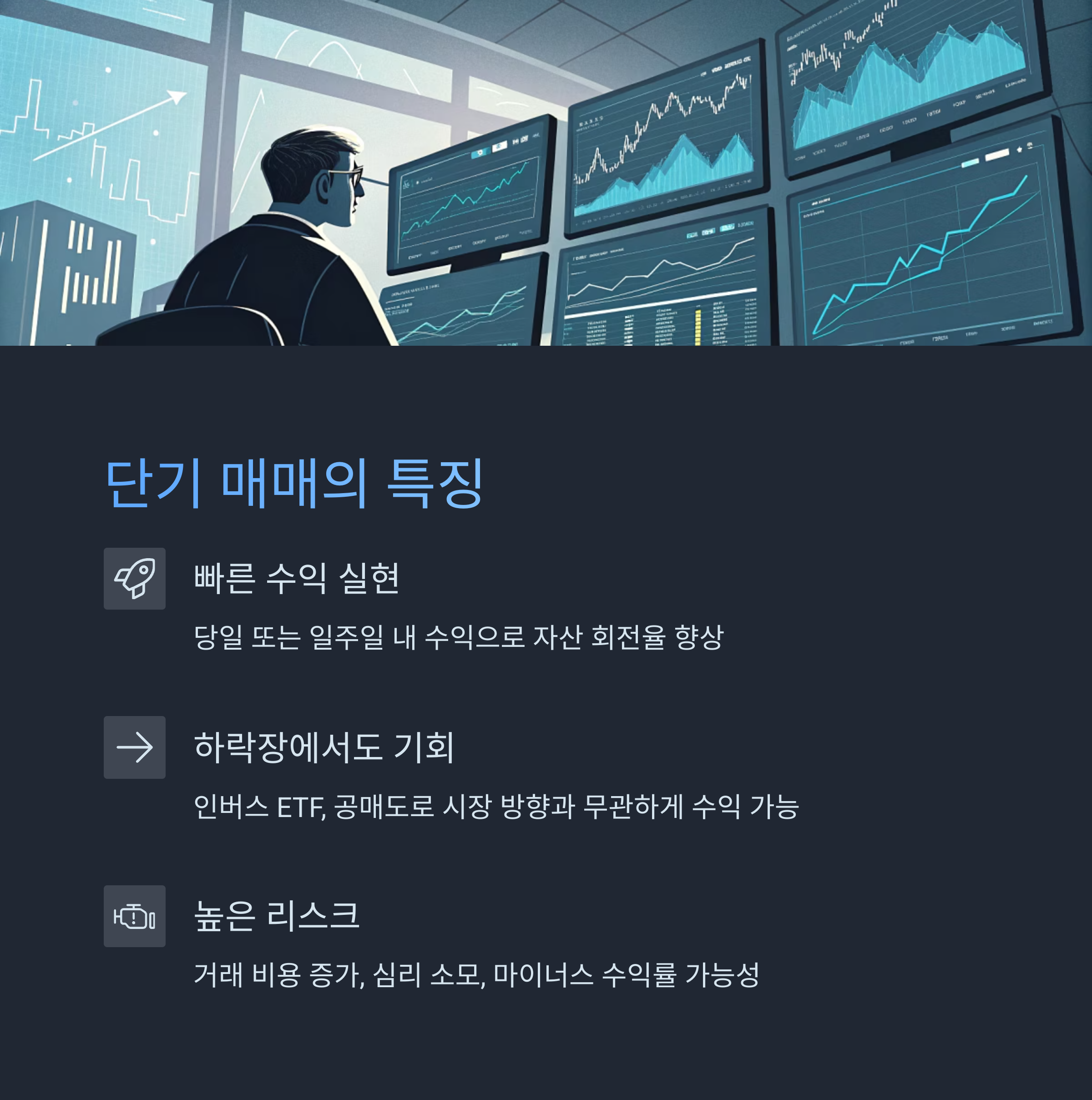 - 단기 매매는 빠르지만 불안정하며 고도의 기술 요구