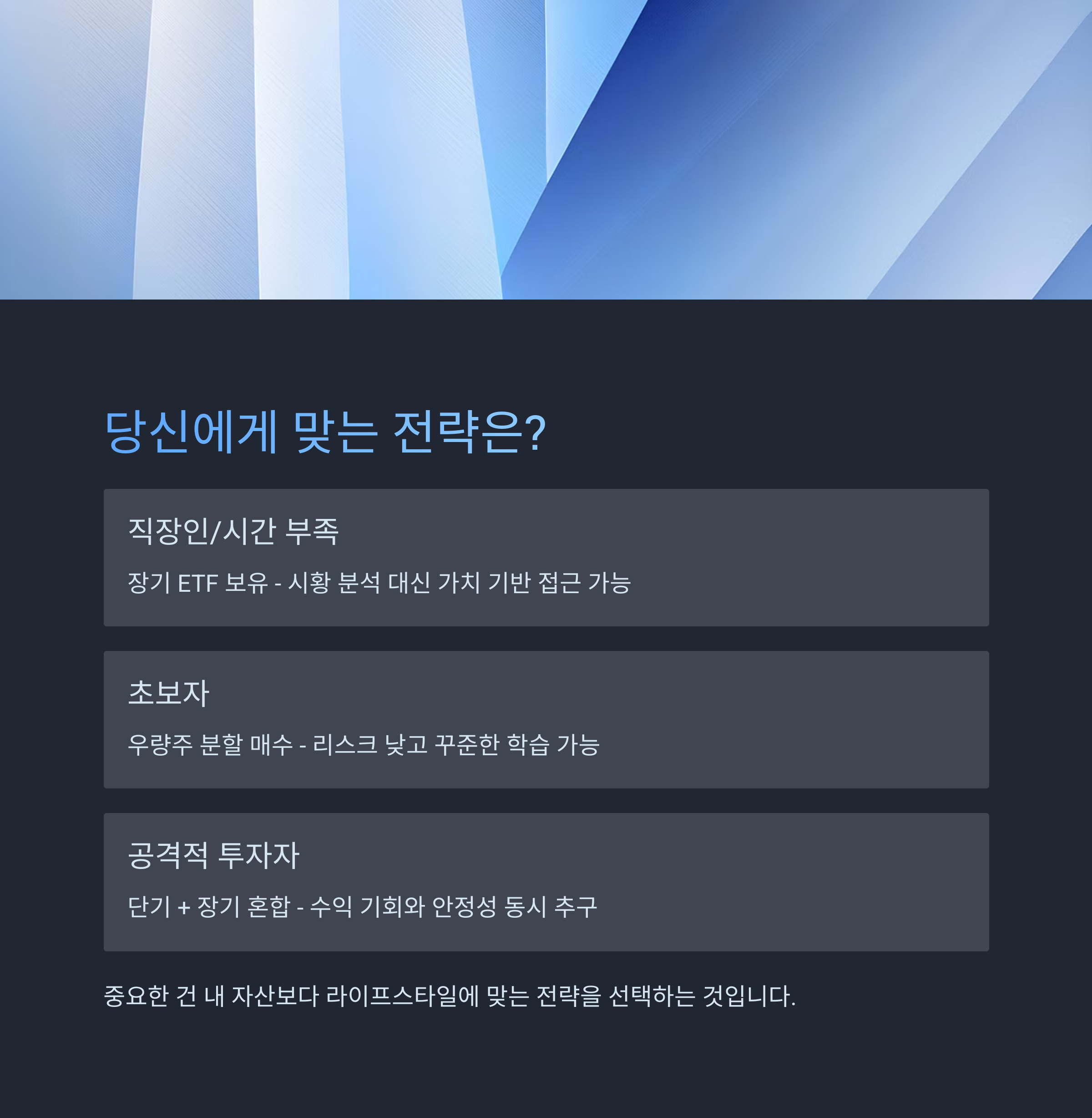 | 직장인/시간 부족 | 장기 ETF 보유 | 시황 분석 대신 가치 기반 접근 가능 |