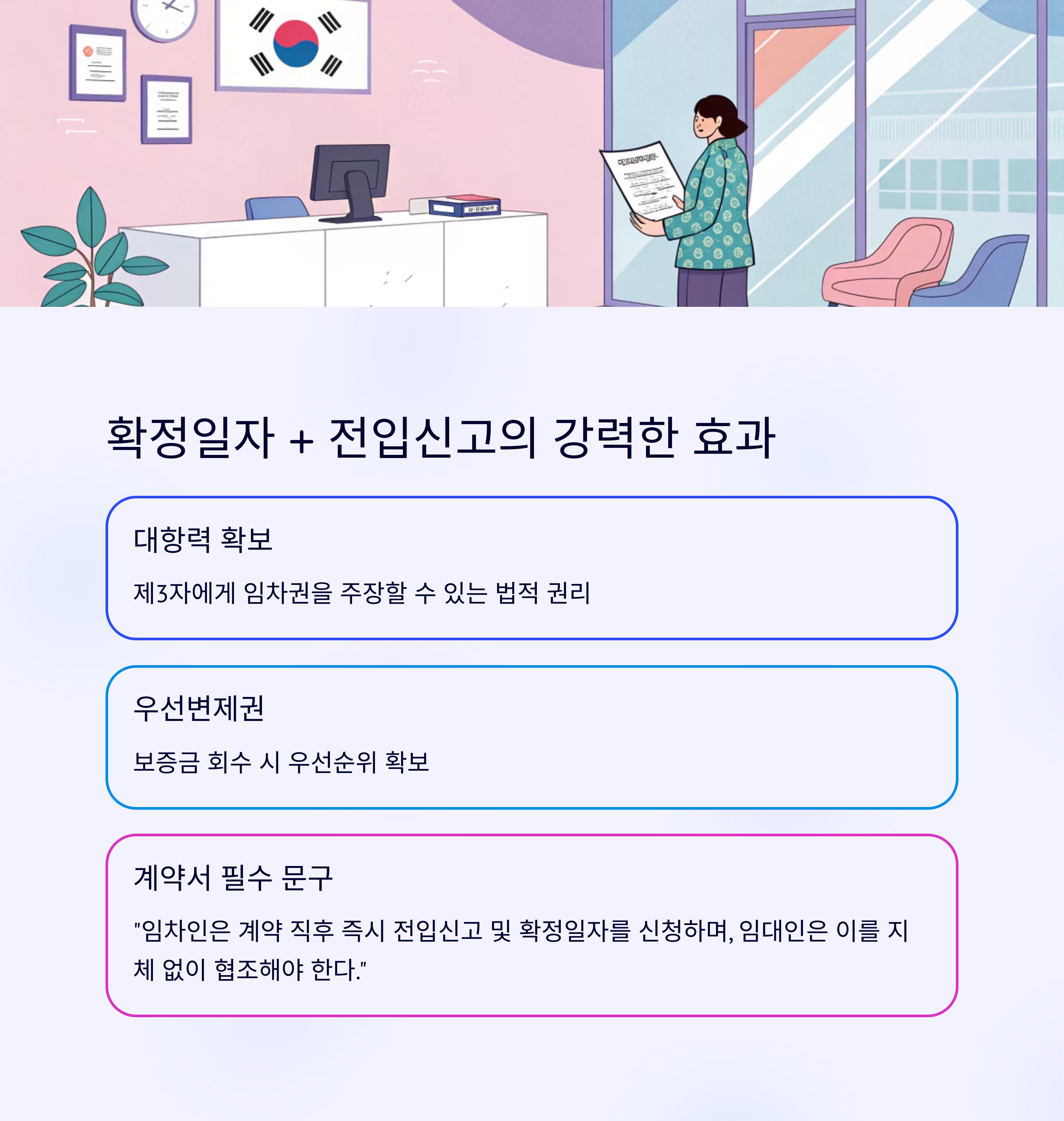 이 두 가지를 통해 임차인은 대항력과 우선변제권을 확보할 수 있습니다.