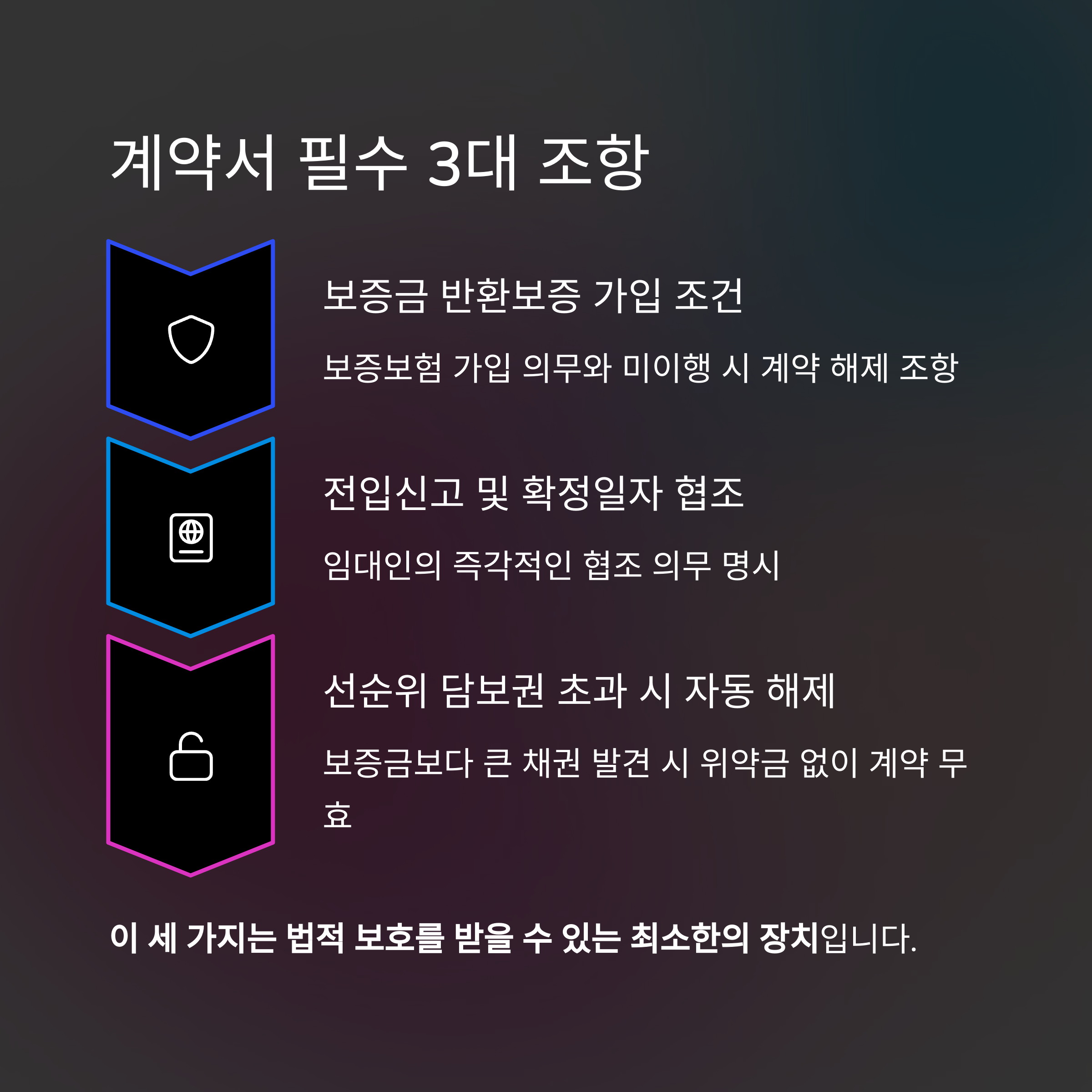 이 세 가지 조항은 계약 이후 문제가 생겼을 때 법적 보호를 받을 수 있는 최소한의 장치입니다.