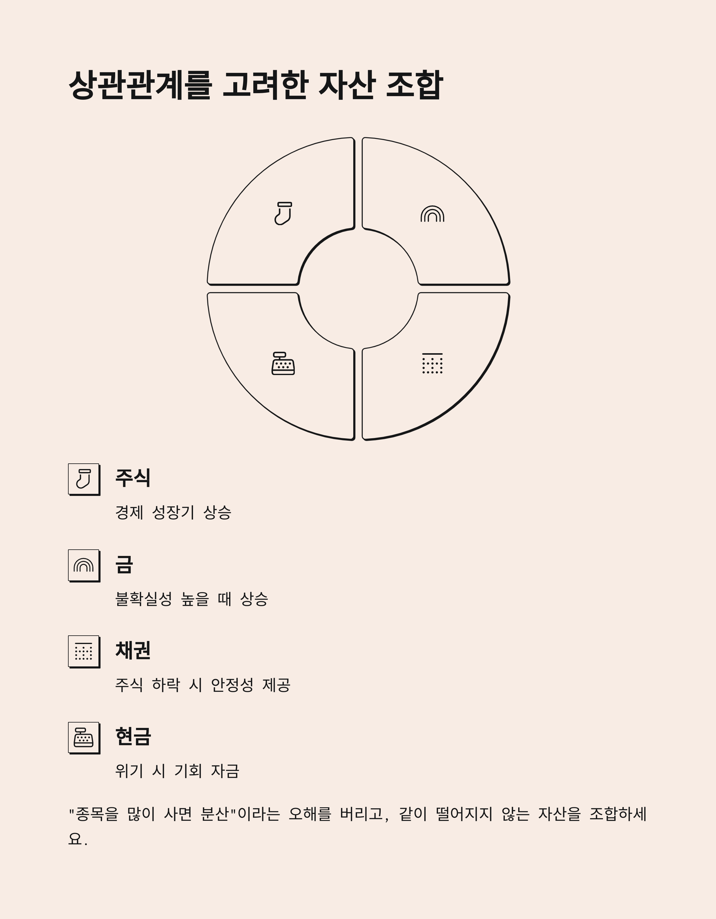 예를 들어, 주식이 하락할 때 채권이나 금이 오르는 구조가 대표적입니다.
