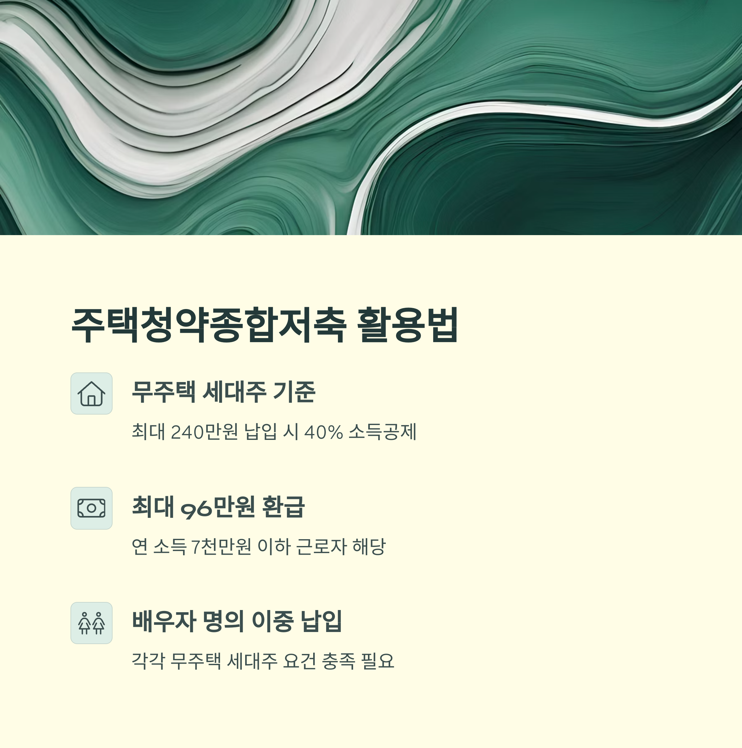 - 무주택 세대주 기준으로 최대 240만 원 납입 시 40% 소득공제