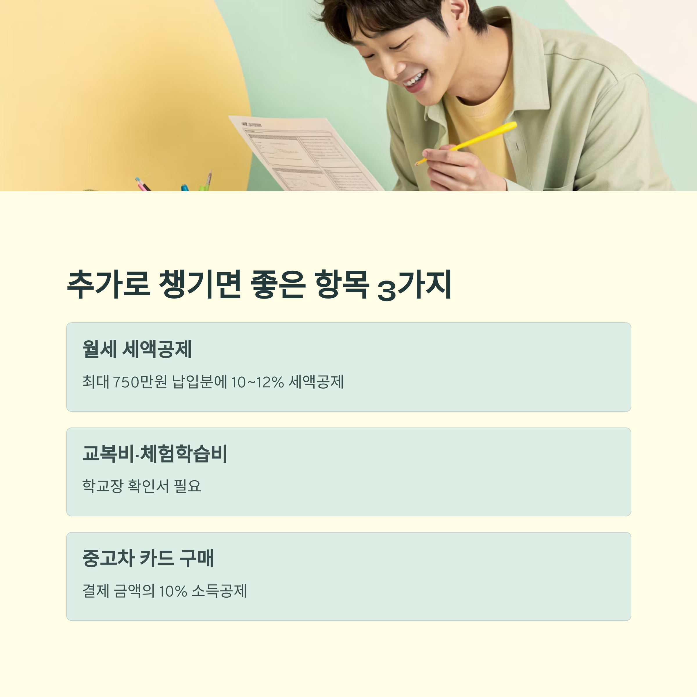 전략 팁: 공제 항목은 교육청 및 홈택스에서 연말 간소화 자료로 일부 자동 반영됨