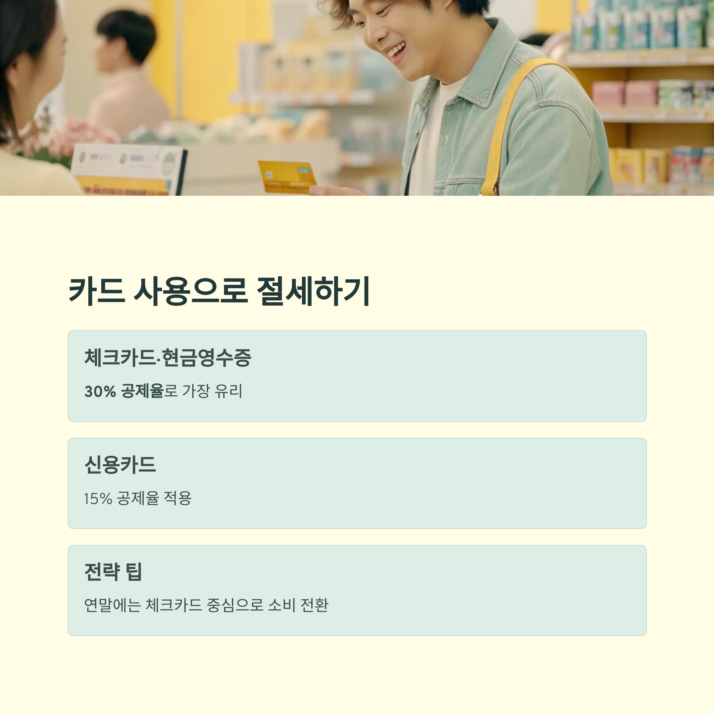 전략 팁: 연초에는 혜택이 큰 신용카드로, 연말에는 체크카드·현금영수증 중심으로 소비 전환