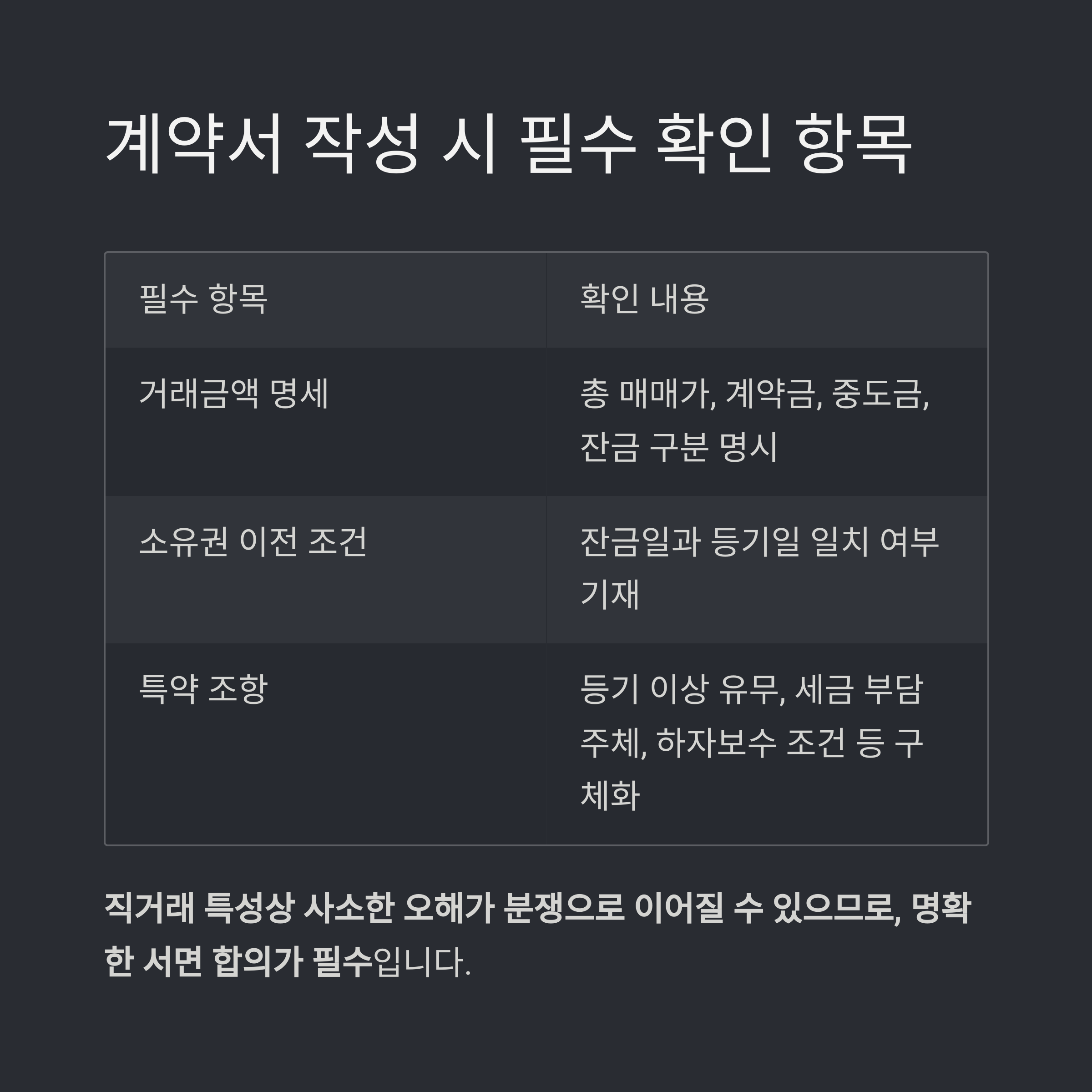 특약 조항 등기 이상 유무, 세금 부담 주체, 하자보수 조건 등 구체화