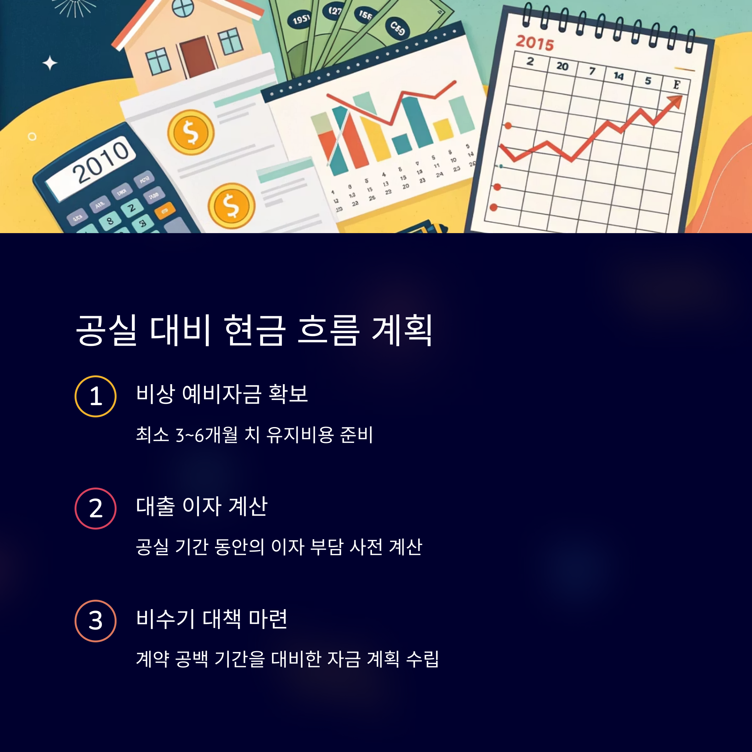 이자 부담 + 공실 기간의 유지비용을 사전에 계산해야 안전합니다.