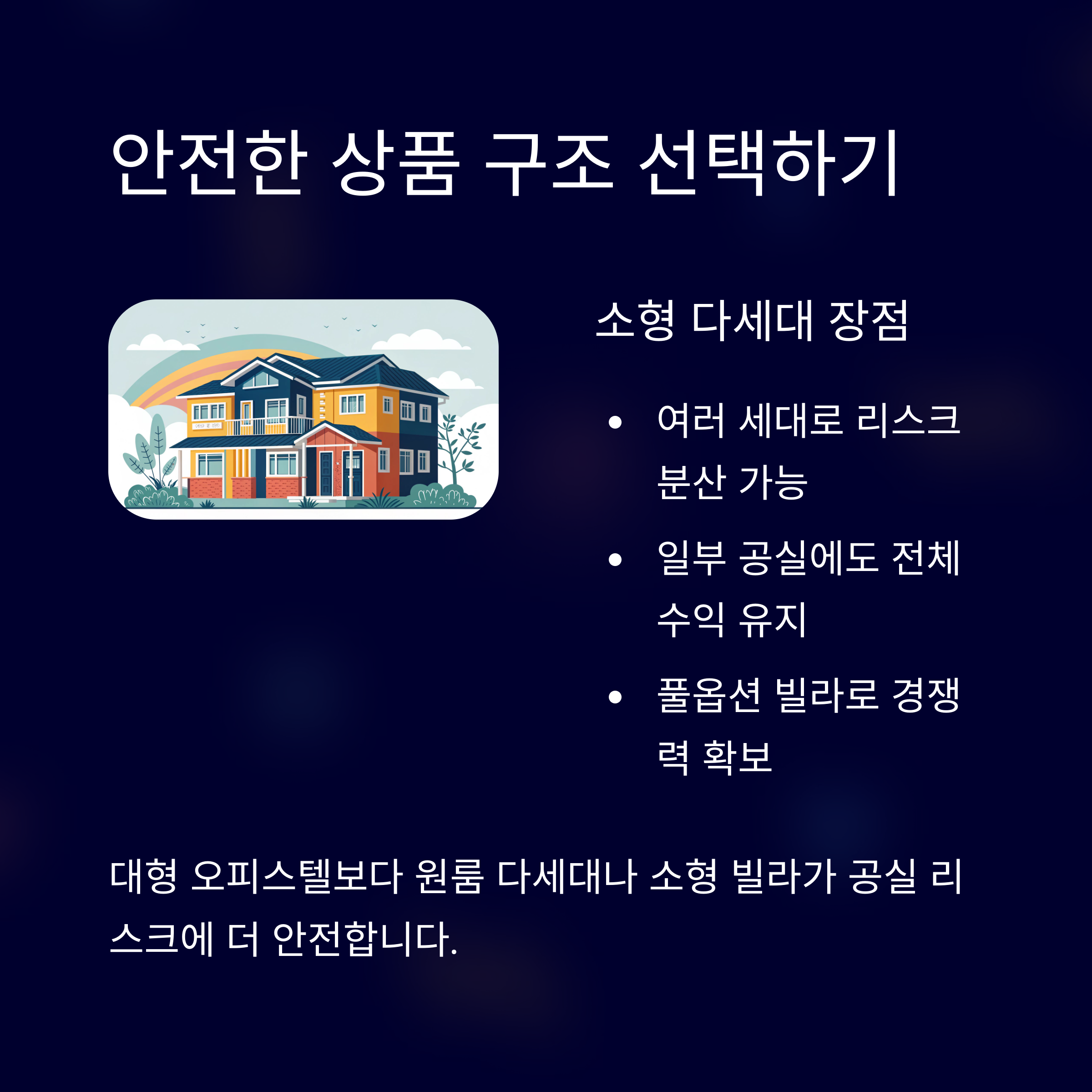 공실률을 최소화할 수 있는 입지 선정, 수요 분석, 상품 전략이 필수입니다.
