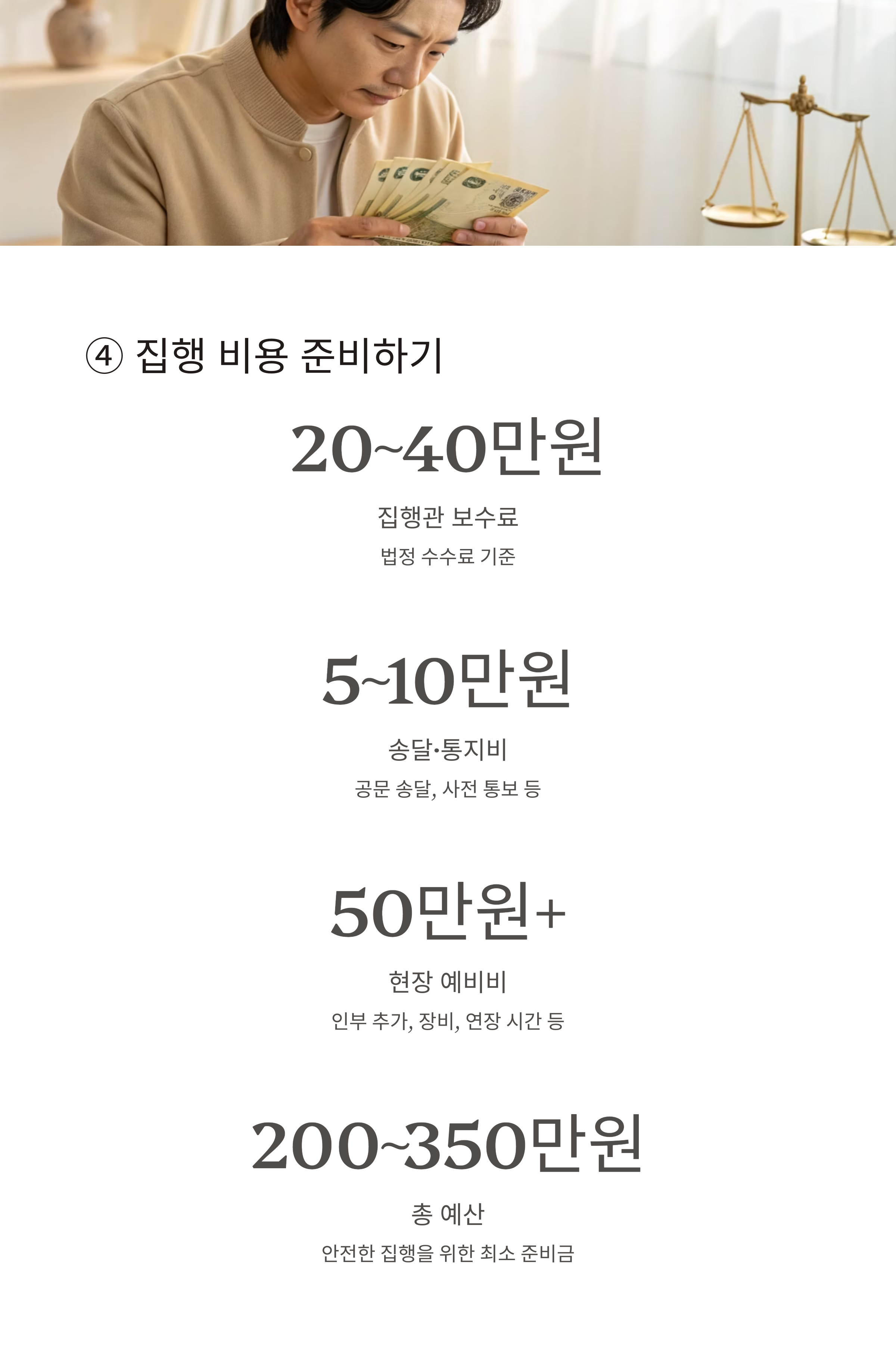 | 집행관 보수료 | 법정 수수료 기준 | 20만~40만 원 |