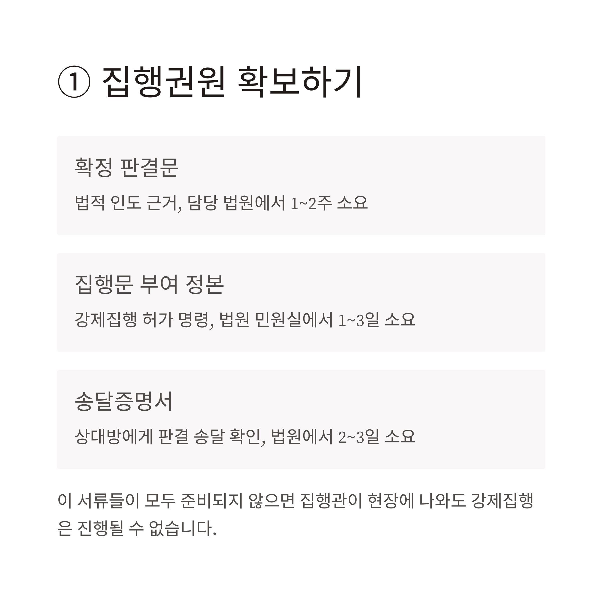 ① 집행권원 확보: 판결문, 집행문, 송달증명서 등 필수 서류 완비