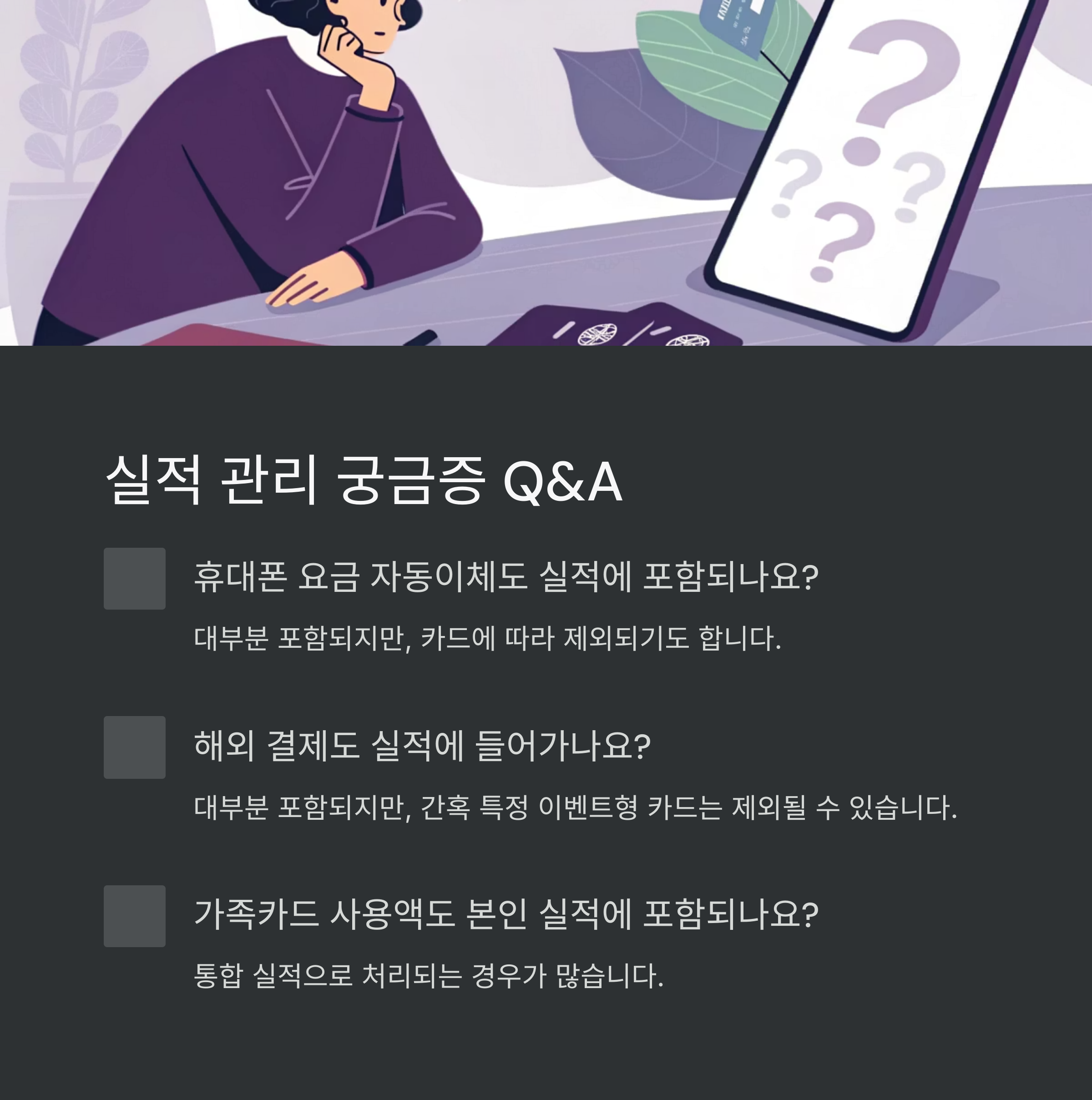 카드마다 혜택을 받기 위한 전월 실적 기준이 다르고, 포함/제외 항목도 제각각입니다.